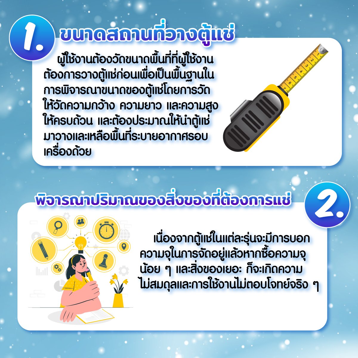 เนื่องจากตู้แช่ในแต่ละรุ่นจะมีการบอกความจุในการจัดอยู่แล้ว หากซื้อความจุน้อย ๆ และสิ่งของเยอะ ก็จะเกิดความไม่สมดุล และการใช้งานไม่ตอบโจทย์จริง ๆ