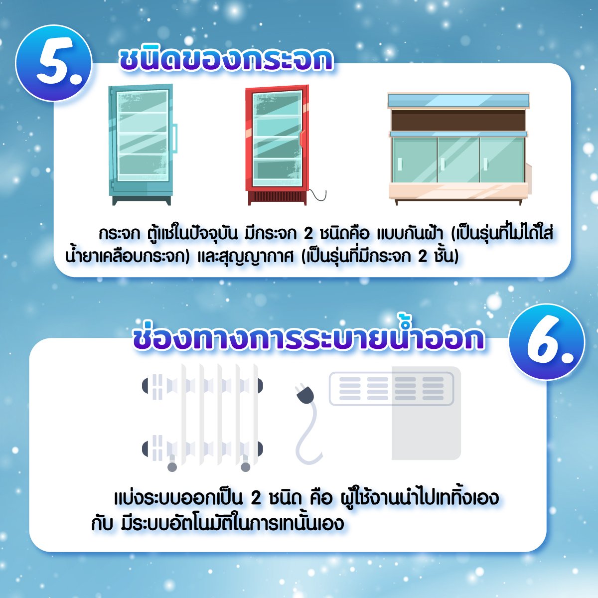 ตู้แช่ในปัจจุบันมีกระจก 2 ชนิด คือ แบบกันฝ้า (เป็นรุ่นที่ไม่ได้ใส่น้ำยาเคลือบกระจก) และสุญญากาศ (เป็นรุ่นที่มีกระจก 2 ชั้น)